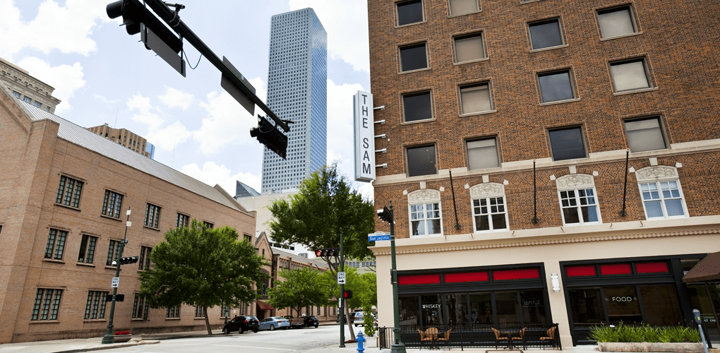 На углу Prairie Street и San Jacinto Street в самом сердце Хьюстона находится сооружение бордового цвета гостиницы — «Sam Houston», которая ровно столетие назад крепко пустила «бетонные корни» в землю Техаса.